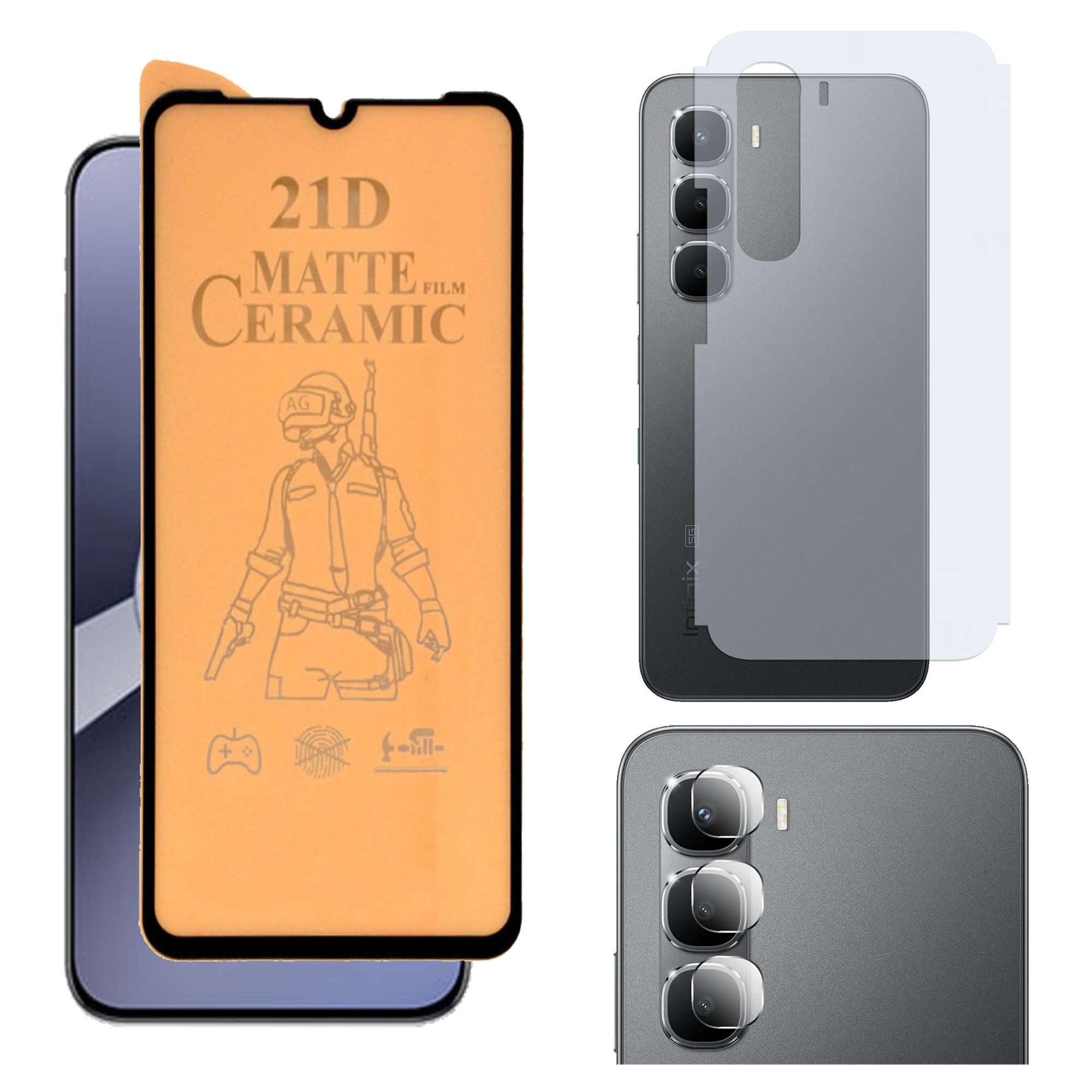 | Items in Box | 1 x Ceramic Glass + 1 x Back Matte + 1 x Camera Protector For Infinix Hot 60 Pro |