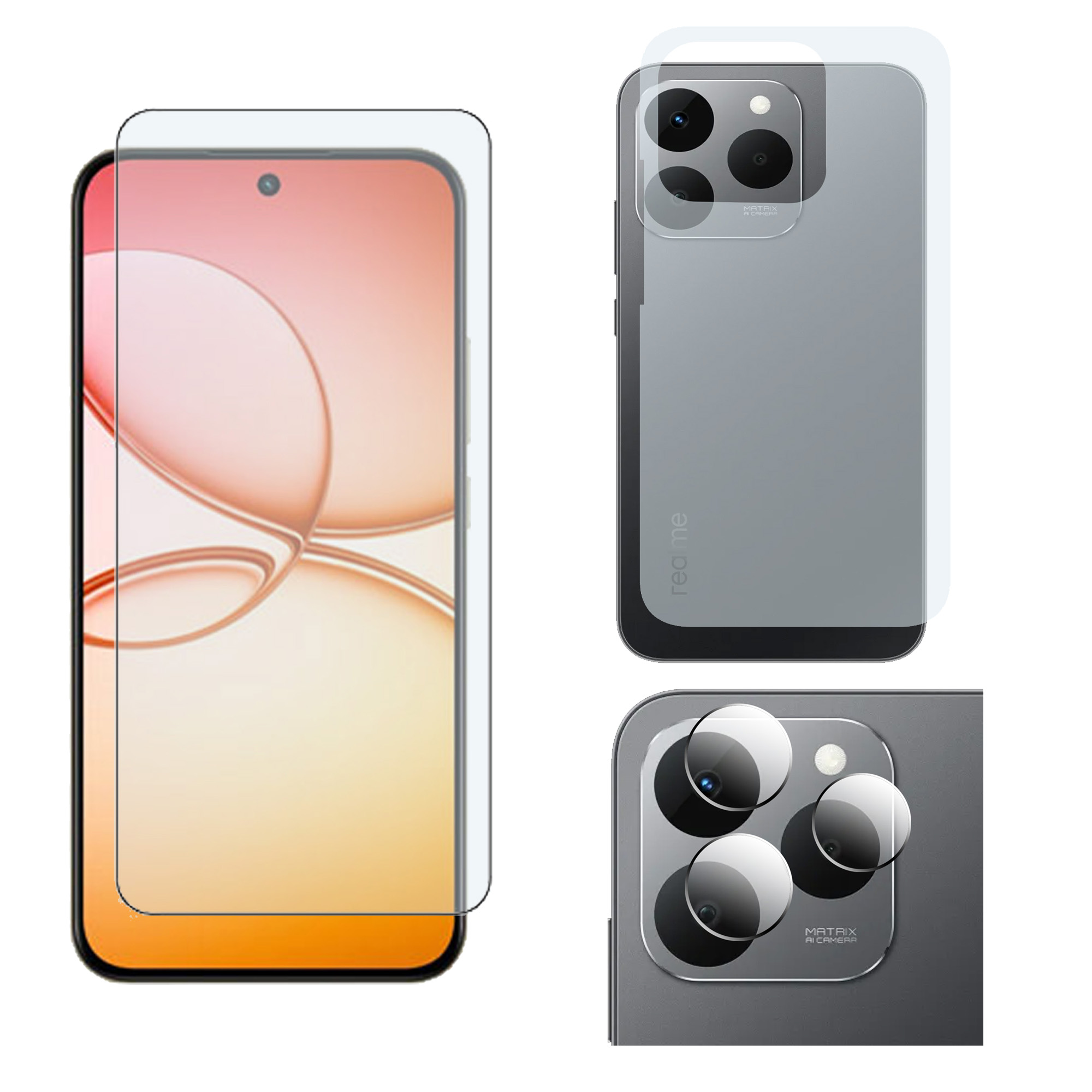 | Items in Box | 1 x Gorilla Glass + 1 x Back Matte + 1 x Camera Protectors For Realme 15T |